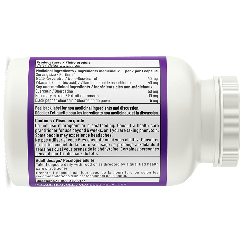Each 40 mg capsule of AOR Acta-Resveratrol provides the equivalent of the amount of resveratrol contained in approximately 180 glasses of red wine. Acta-Resveratrol is prepared under controlled humidity and low light conditions for optimal effectiveness and stability. The vitamin C, quercetin and rosemary extract contained in this product enhance the powerful antioxidant action of resveratrol and enhance its various health benefits.