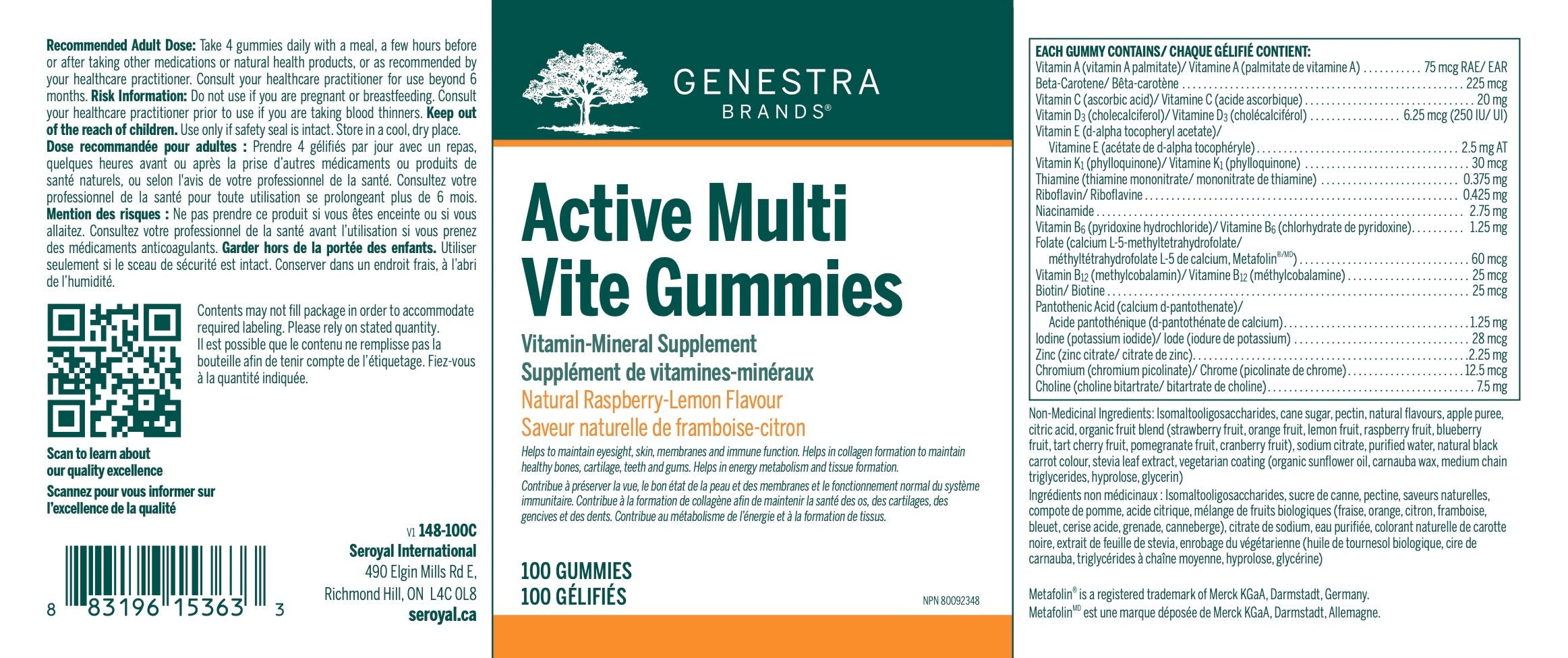 Active Multi Vite Gummies provide a concentrated combination of 17 vitamins and minerals in a great tasting format with added choline and organic fruit blend. Many Canadians do not consume the right amount of essential vitamins and minerals. This formula is packed with nutrients to support optimal nutritional status, including two forms of vitamin A, all eight B vitamins, the antioxidant vitamins C and E, vitamins D and K essential for bone health as well as zinc, iodine and chromium. This formula as a whole supports immune function, antioxidant defense, energy and healthy glucose metabolism, strong bones and teeth, eyesight and night vision, and healthy hair, skin, and nails. The product also includes choline which provides valuable support to the liver. Plus, each berry-shaped gummy contains just 0.5g of sugar from natural sweeteners and isomalto-oligosaccharides, a plant fiber found naturally in fermented foods and honey. Active Multi Vite Gummies contain no gelatin, artificial colors or flavors and provide a convenient and delicious way to increase your daily intake of absorbable vitamins and minerals.