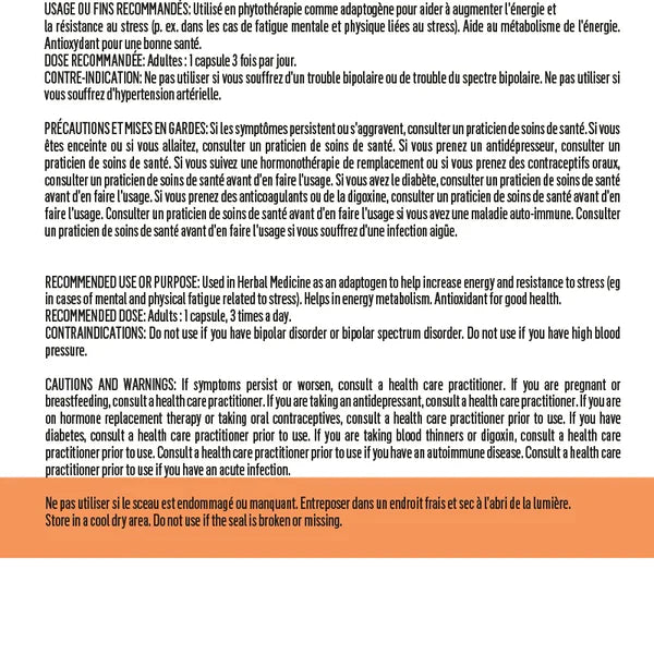 Used in herbal medicine as an adaptogen to help increase energy and resistance to stress (eg in cases of mental fatigue and physical fatigue linked to stress). Helps with energy metabolism. Antioxidant for good health.