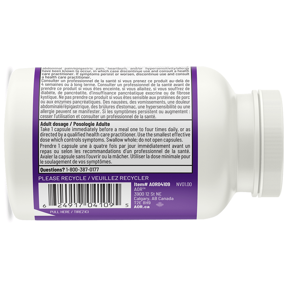 AOR Zymes is a complete digestive system support that contains proteases to digest proteins, alpha-amylase to digest starch and lipase to digest lipids. It also contains alpha-galactosidase for the digestion of difficult-to-digest polysaccharides such as those contained in legumes and vegetables, known to cause gas and bloating. AOR Zymes is a cocktail of pancreatic enzymes isolated from pork. Mammalian pancreatic enzymes are similar to those naturally present in the human body and are more effective than plant enzymes.