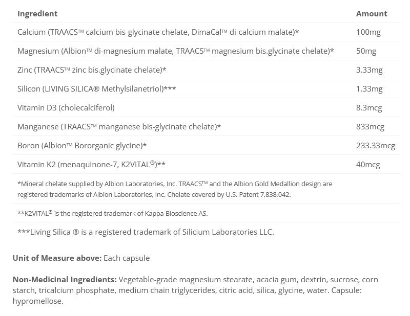 This formula is supplemented with the necessary nutrients to support the bone building process. Vitamin D3 is essential for the absorption of calcium from the digestive tract, while approximately 50-60% of all magnesium is actually stored in bones and it is needed to activate enzymes related to vitamin D3 metabolism. Vitamin K2 has emerged as a key player in the bone health category, with its ability to activate two proteins, osteocalcin and matrix protein-GLA, to shunt calcium toward the skeletal system and away from the cardiovascular system. Trace elements such as zinc, manganese and boron also play a crucial role. Zinc and manganese are cofactors of several enzymes involved in bone formation, while boron prevents calcium excretion through the kidneys. Various combinations of all of these nutrients have been shown to positively affect bone mineral density markers.