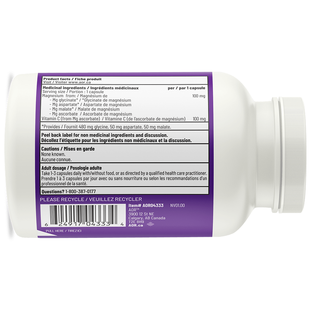 Magnesium is a critical element for energy production in the body since it binds to ATP (adenosine triphosphate) to generate and use this energy. Equal amounts of malate and aspartate ions are added to support the malate-aspartate shuttle, an important metabolic process involved in energy production within the body. Magnesium ascorbate provides vitamin C which helps prevent the drop in vitamin C levels often associated with low magnesium levels. Magnesium glycinate is a well-tolerated and well-absorbed form because the entire compound passes through the intestinal wall, reducing the risk of diarrhea.