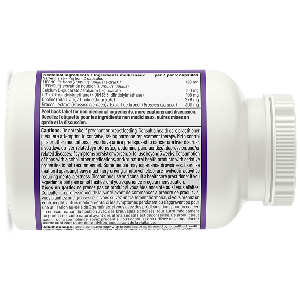 Estro Adapt® reduces the risk of abnormal estrogen-related cell growth through various mechanisms. It favors the synthesis of “good” estrogens over “bad” estrogens thanks to DIM, a metabolite of I-3-C. DIM also promotes normal growth of cervical tissue. 8 PN is a phytoestrogen found in hops that limits abnormal cell growth in breast tissue and interferes with unwanted estrogenic activity. D-glucarate, choline and SGS promote the detoxification of excess or inactivated hormones. Estro Adapt® may also support normal and regular menstruation through its estrogen modulating effects.