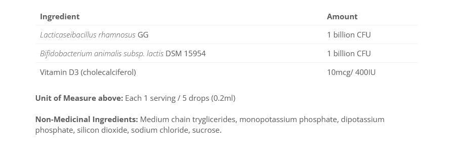 - 2 billion colony forming units per 5 drops, containing equal parts of Lacticaseibacillus rhamnosus GG and Bifidobacterium animalis (subsp. Lactis DSM 15954)