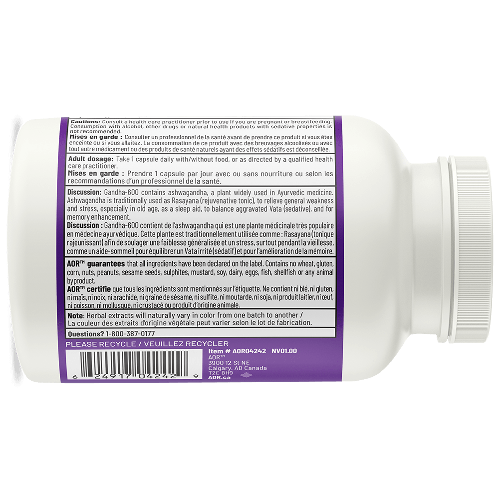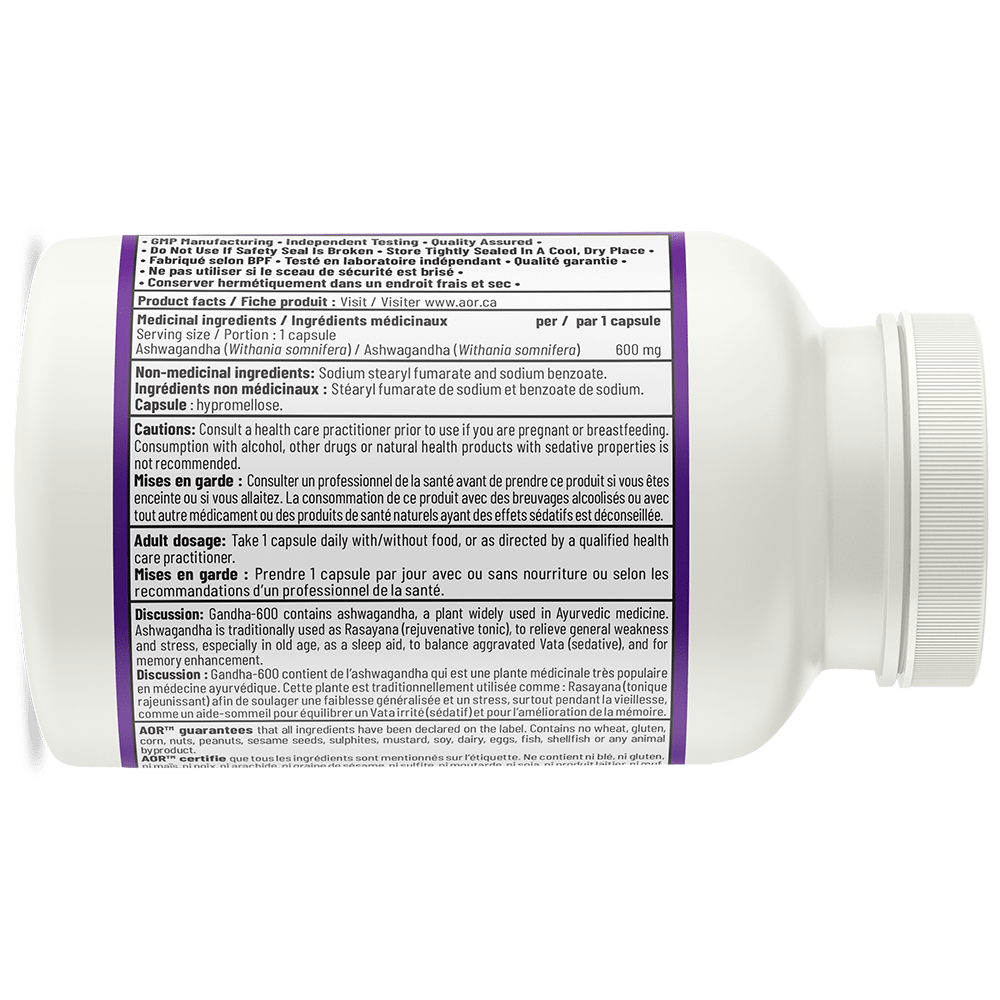 It is important to always standardize plant extracts to ensure reliable and consistent results for users. Withanolides are the first active compounds discovered in ashwagandha. Recently, a group of compounds derived from withanolides, sitoindosides, has been discovered and appears to be responsible for much of the anti-stress and anti-anxiety activities of this plant. AOR's Gandha-600 is standardized to withanolides and sitoindosides. Just one capsule per day is enough to get the recommended dose: 600 mg of a powerful 10:1 extract.