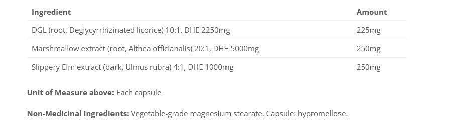 - Delivers a blend of deglycyrrhizinated licorice root (DGL), marshmallow root and slippery elm in highly potent extracted forms