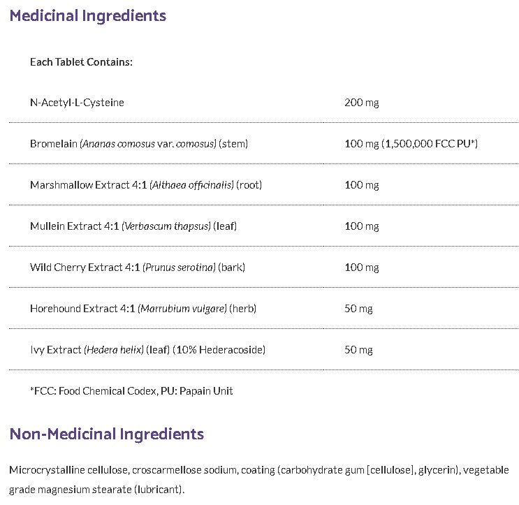 Proteolytic enzymes can reduce the viscosity of mucous secretions, and in a randomized trial, bromelain reduced symptoms of acute sinusitis in children more effectively than standard treatment. Marshmallow is widely used for coughs and soothing irritated mucous membranes, with mucilaginous and bioadhesive effects attributed to polysaccharides extracted from the root. English ivy extract increases bronchial beta-2-adrenergic activity, relaxing bronchial smooth musculature and increasing surfactant factors. English ivy extract increases bronchial beta-2-adrenergic activity, relaxes bronchial smooth muscles and increases surfactant factors. It has been shown to be an effective treatment for acute bronchitis and improves lung function in children with asthma when used as an adjunct to standard drug therapy. Mullein, wild cherry, and bale extracts also have a long history of use for various respiratory tract conditions. Mullein, wild cherry, and bale extracts also have a long history of use for various respiratory tract conditions. These ingredients complement this formula with a unique combination of demulcorating, emollient, expectorant and antitussive properties to relieve symptoms.