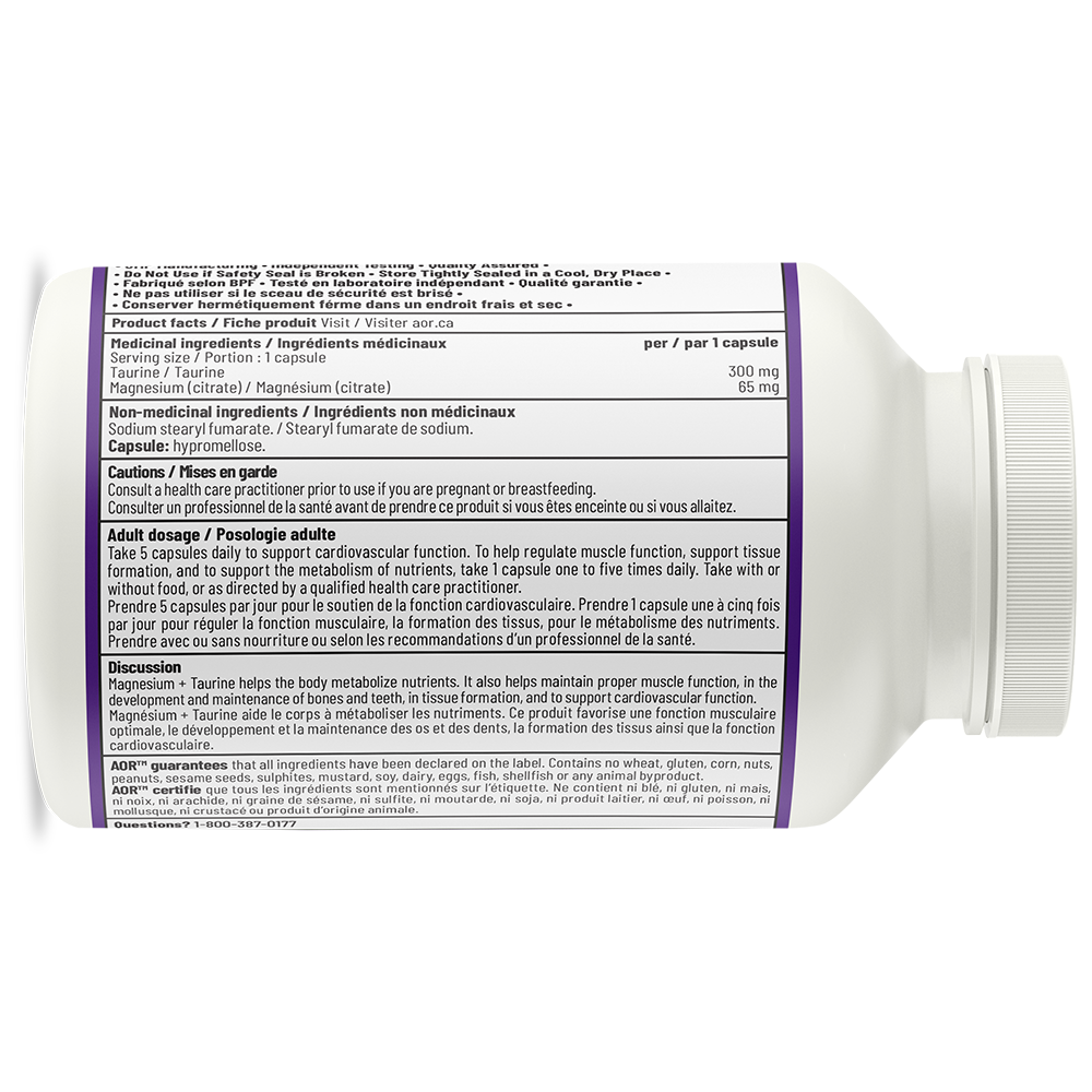 AOR Magnesium Taurate provides balanced doses of magnesium and taurine. This combination is based on the results of various compiled research demonstrating that magnesium and taurine share many similar physiological functions, particularly in various cardioprotective effects, and that taurine can help fulfill the role of magnesium in cases of deficiency.