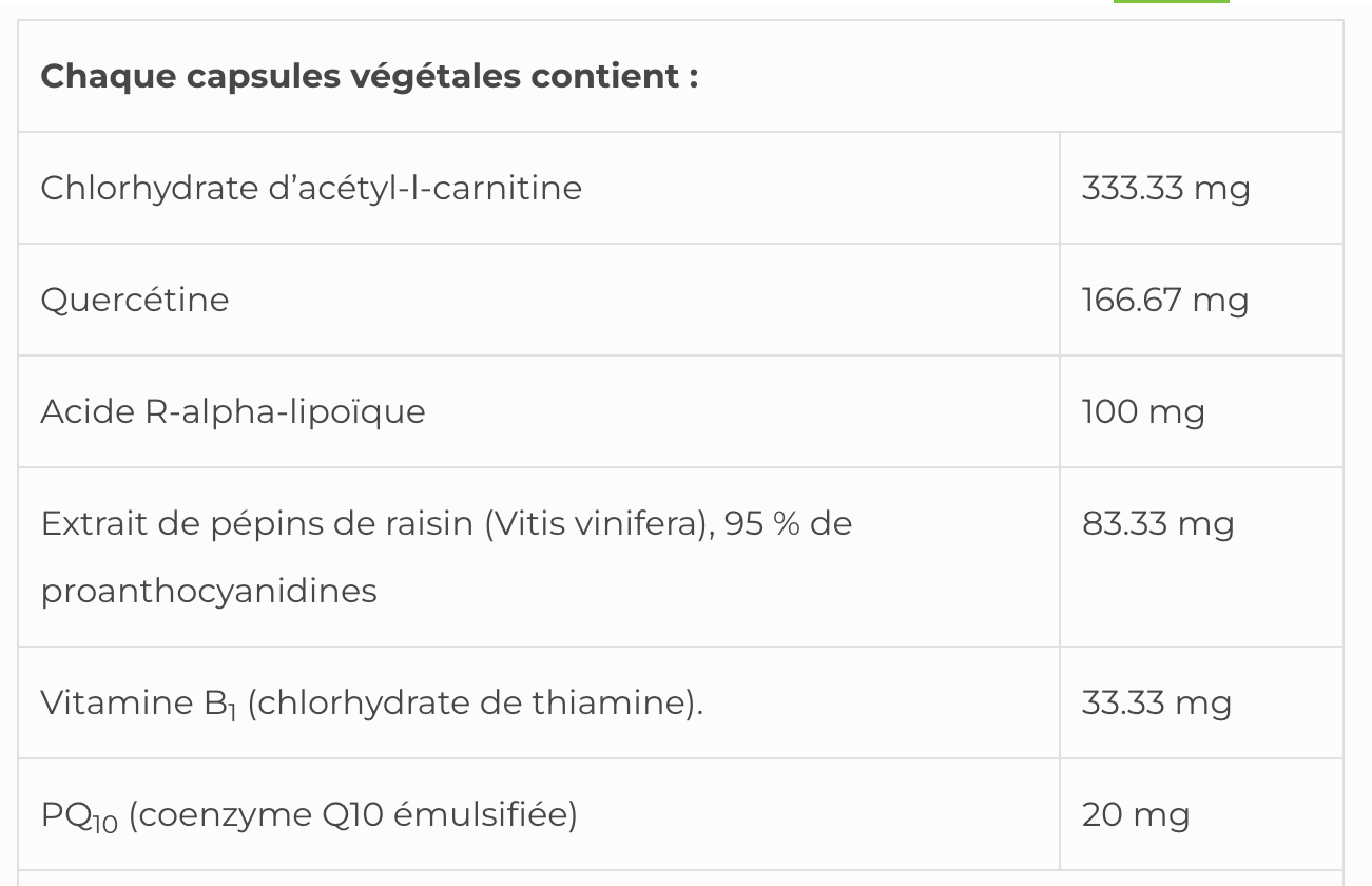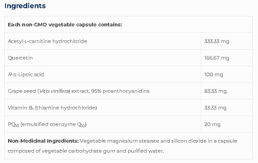 Mito SAP contains a combination of active ingredients, namely N-acetyl-L-carnitine, quercetin, R-α-lipoic acid, grape seed extract, thiamine and coenzyme Q10 (as PQ10; pea-emulsified coenzyme Q10 for enhanced absorption) of the highest quality and effectiveness for optimal mitochondrial support.