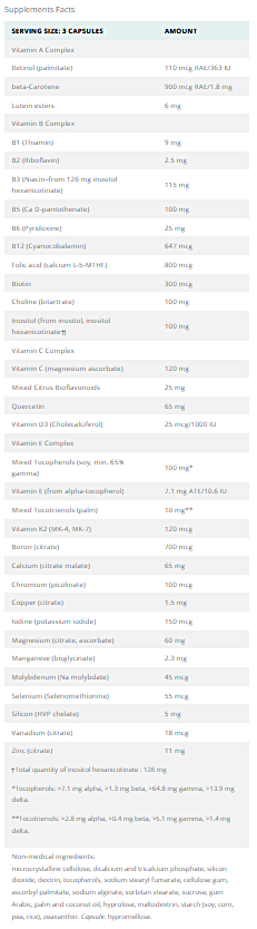 Multi Basics 3® provides optimal doses and balanced doses of all the recognized, highest quality, research-backed essential vitamins and minerals. A balanced, well-designed multivitamin is fundamental to any supplement regimen. Multivitamin and mineral formulations are a great way to meet your daily nutritional needs for all essential nutrients, providing a foundation on which you can build better health. Although some nutrients like vitamins A and E are better absorbed and more effective in their natural form, others, like folate and other B vitamins, are better absorbed in the form of synthetic supplements. Multi Basics 3® takes all of these factors into account, creating a carefully formulated, balanced and effective multivitamin with many more benefits than a typical multivitamin, with just three capsules per day.