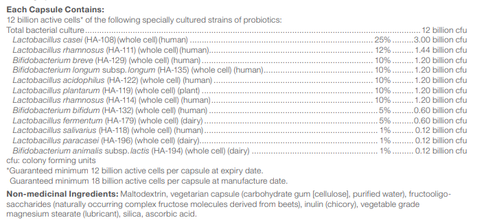 - High potency with at least 12 billion cfu per capsule at expiration date (guaranteed minimum of 18 billion active cells at manufacturing date)