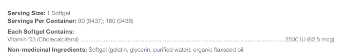 - 2,500 IU of vitamin D per capsule allows for easy daily dosing