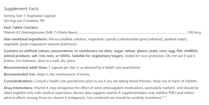- Provides 100 mcg per serving of vitamin K2 in the form of menaquinone-7 (MK-7)