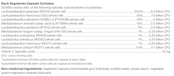 - Contains 10 specific strains of Lactobacillus and Bifidobacterium and a minimum of 25 billion CFU per vegetarian capsule (85 billion at the date of manufacture)